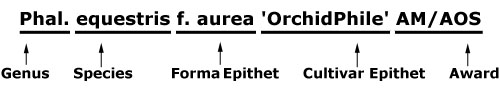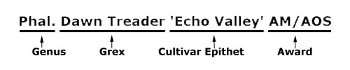 In the example above, you can see the normal binomial form in the genus, (Phal., abbreviated from Phalaenopsis), and the grex (which would correspond to the specific epithet for a species). But there are two more terms as well. There is a cultivar epithet, that identifies a single cultivar, and all of its divisions or propagations, (including mericlones), and a term that represents an award that cultivar has won from the American Orchid Society. The cultivar epithet and the award are optional terms. Not every plant is worthy of being named, and it follows then that not every plant is of sufficient quality to receive an award.