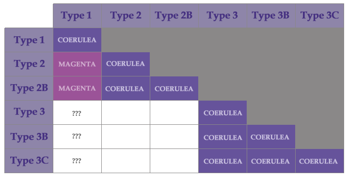 For a very long period of time we only had two primary groups of coeruleas to work with.  Type 1 and Type 2 as it turns out are completely incompatible.  So breeding between Type 1 and Type 2 coeruleas will about 95% of the time produce 100% magentas, subsequent attempts to produce coeruleas from that progeny will also produce 100% magenta flowers.
